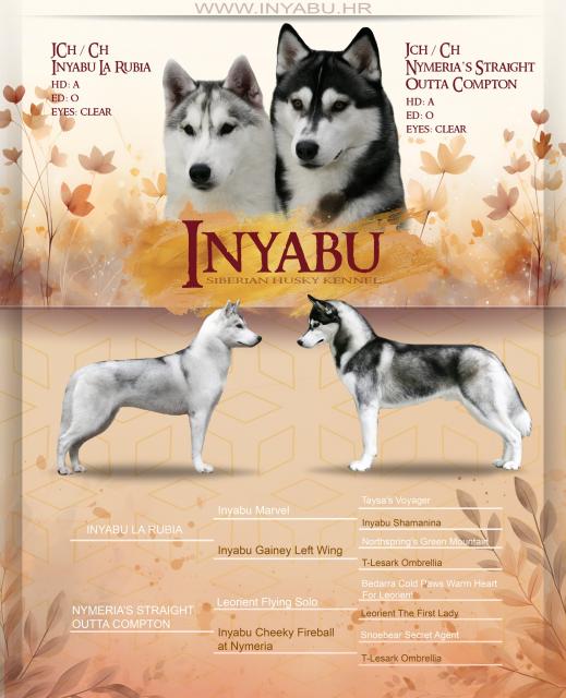 Ovo leglo nam je od izuzetne važnosti, jer smo po prvi put napravili kombinaciju između dva Inyabu psa. Poveznicu dvije temeljne kuje naše uzgajivačnice, Int CH. R.BIS winner, Inye June of Siberian Lady "Inye" & CH. BISS Winner T-Lesark Ombrellie "Roxy".